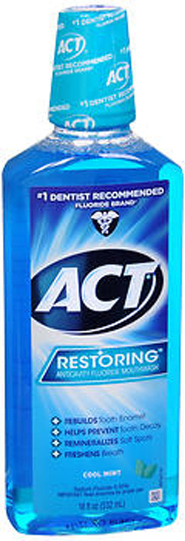 Expertly formulated with fluoride, this ACT Restoring Anticavity Mouthwash in Cool Mint flavor helps to prevent tooth decay and cavities. Its powerful ingredients strengthen enamel and protect against acid erosion, giving you a healthier, brighter smile. Enjoy the refreshing mint flavor as you protect your teeth with this 18 oz. bottle.